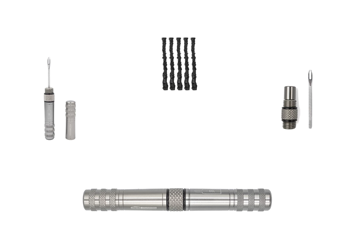 Reparationssættet er lavet i et smart design, hvor nål, fil, strips/plugs og Co2 hoved alt sammen er gemt i et kompakt rør, som kan tages med i lommen.