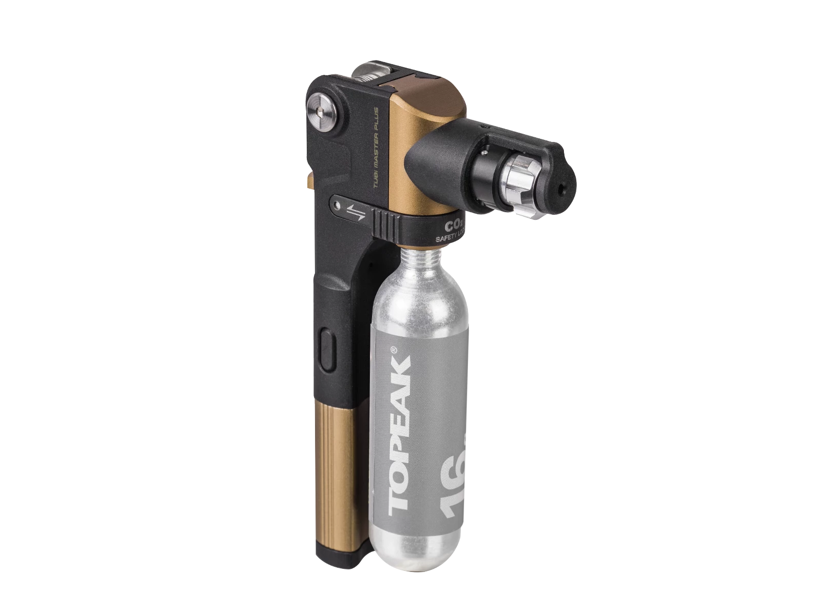 CO2 pumpehovedet passer til Presta & Schrader-ventiler og holder en 16g eller 25g CO2-patron.